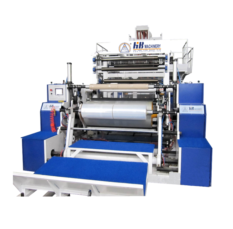 本生產(chǎn)線以LLDPE(線性低密度聚乙烯)為主要原料,采用幾種不同牌號的樹脂,通過擠出機擠出而生產(chǎn)出具有自粘性的單面粘或雙面粘三層、五層拉伸纏繞膜。此生產(chǎn)線使用牧草膜專用配方和工藝后,可生產(chǎn)牧草青貯膜。